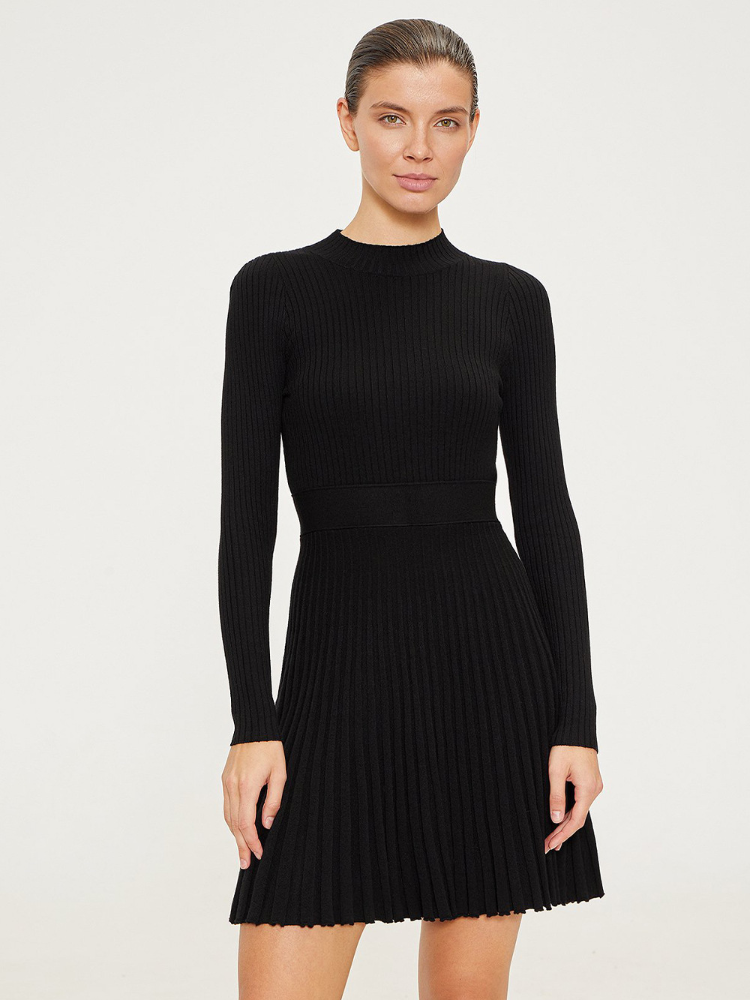 Women's Knitted Casual High Waisted O-neck Pleated Dress Slim Solid Color Long Sleeved Mini Dresses Classic Lady Street Vestidos