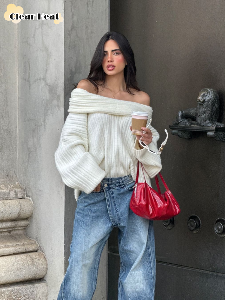 2024 Women Fashion Off Shoulder Solid Pullover Extended Elongated Sleeves Ultra Soft lady Knitted Sweater Chic Autumn Streetwear