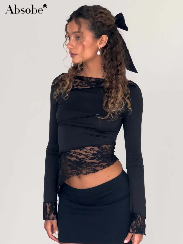 Absobe Lace Asymmetrical Patchwork Crop Top Women Crew T-shirt Petal Sleeve Sheer Versatile Slim Tee Hottie Outfit Streetwear