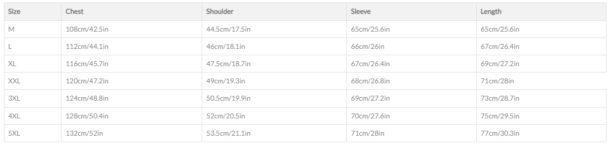 Jacket Size Chart (Cm)